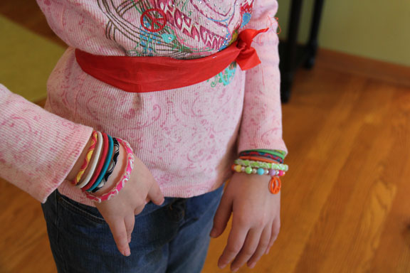She wears hair ties as bracelets.